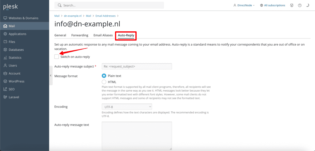4. Klik vervolgens op het tabblad ‘Auto-Reply’ en zet het vinkje aan bij ‘switch on auto-reply’.