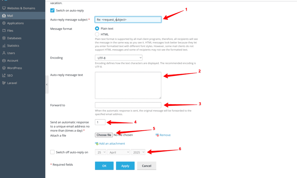5.6: Ook deze stap is optioneel: je kunt ervoor kiezen om het automatische antwoord op een zelf gekozen datum uit te schakelen. Zet hiervoor het vinkje aan bij ‘Switch off auto-reply on’ en kies de gewenste einddatum.